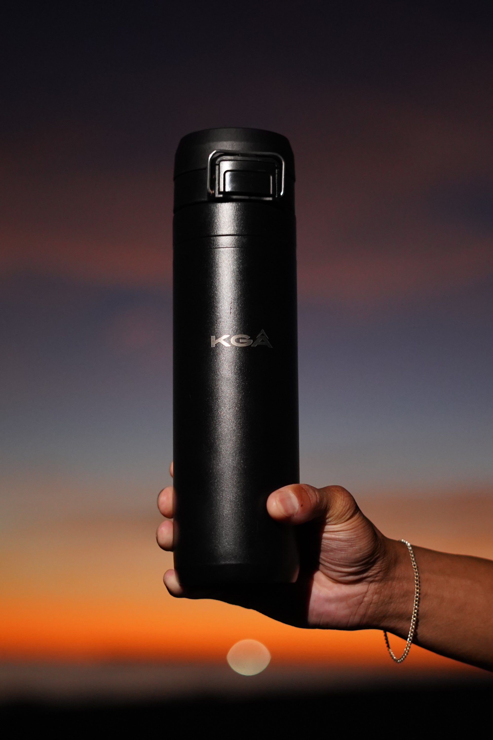 This insulated steel water bottle features a laser engraved logo that will never tarnish, metal security clip, one-touch secure lid and slip-free texture, so no matter how long or aggressive the day gets, your drink is safe & stays it’s temperature for countless hours, no matter what.
